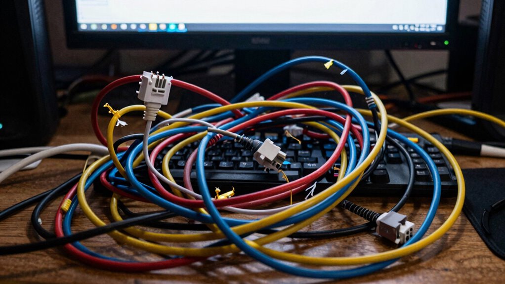 A bad cable layout creates visual chaos that drains your mental energy and makes focusing harder. When cables are tangled or disorganized, your brain works overtime to process the clutter, increasing cognitive load. Constantly searching for the right cable or untangling knots interrupts your flow and adds to feelings of frustration. Over time, this mental drain can lead to fatigue and overwhelm. Keep going to discover how proper organization can help restore your focus and calm.