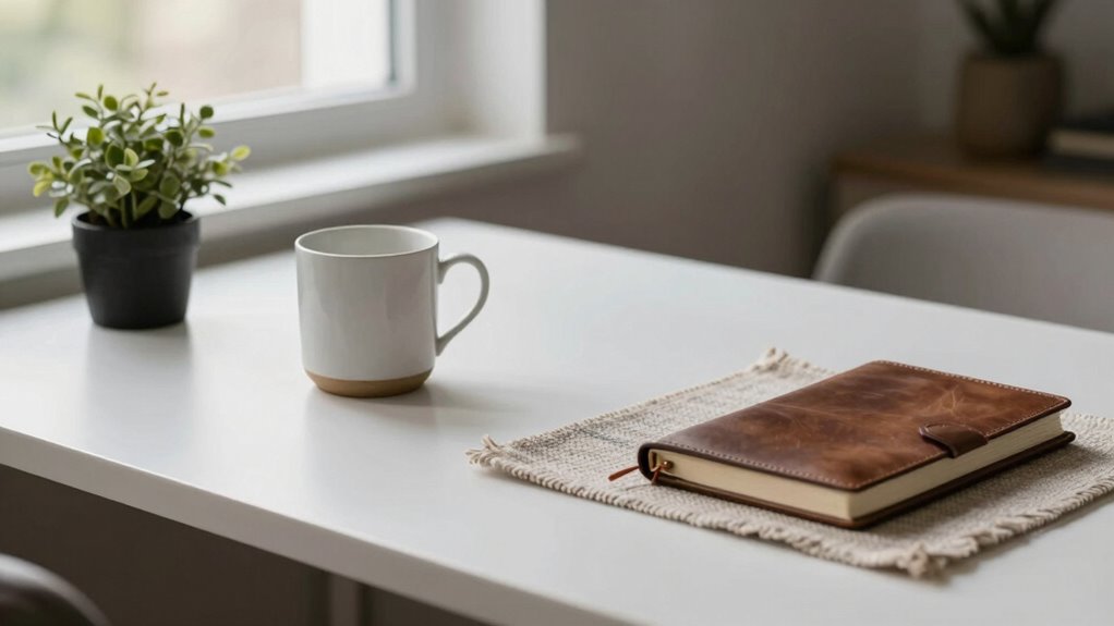 Beyond decor and greenery, maintaining a clean and organized surface is key. Use storage solutions like trays, drawers, or desktop organizers to keep clutter out of sight, but ensure everything has a designated place. A tidy desk reduces visual noise, helping you concentrate on your tasks without feeling overwhelmed. When you do clear your workspace, take a moment to wipe down surfaces; a clean desk feels more inviting and presents a sense of order. Regularly organizing your workspace can also help maintain a calm environment and prevent clutter from accumulating over time. Incorporating ergonomic design principles can further enhance comfort and reduce physical strain, contributing to a more relaxed workspace.