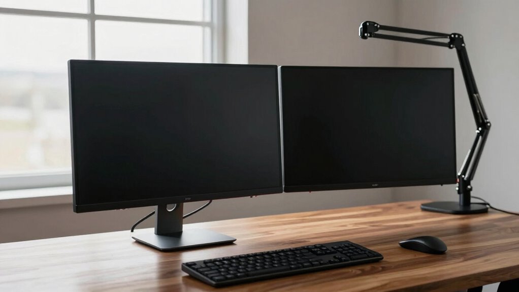 Imagine you’re a modern-day Leonardo da Vinci, perfecting your workspace. The ideal angle for your second monitor is about 15 to 20 degrees from your primary screen, so it feels natural to glance at without twisting your neck. Keep the top of the monitor at or slightly below eye level, and make certain your head remains straight. This setup reduces strain, keeps you comfortable, and boosts your productivity.