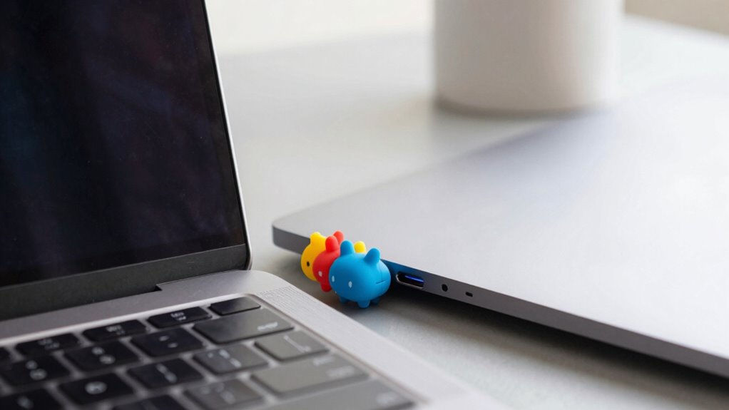 This trick works well for large dongle storage and managing multiple devices. You might worry about space, but the method is designed to keep all your dongles organized without damage. Since it keeps each dongle secure and easy to access, you won’t have trouble with large or multiple dongles. Just guarantee your storage container is big enough, and you’ll streamline your device management effortlessly.