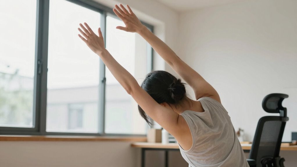 The best stretch to quickly undo ‘desk shoulders’ is the chest opener. Stand tall, clasp your hands behind your back, and gently pull your arms downward while keeping your shoulders relaxed. Breathe deeply and hold for 20-30 seconds. Doing this regularly helps loosen tight chest and shoulder muscles, restore better posture, and reduce stiffness. Keep practicing this move consistently, and you’ll discover simple ways to stay aligned and comfortable throughout your day.