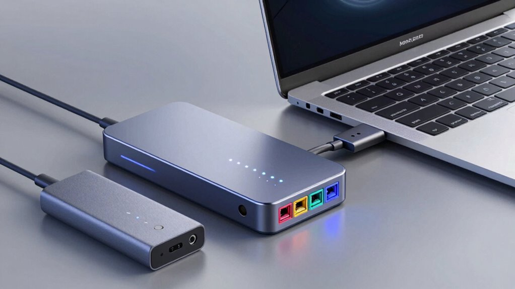 Think of your devices as puzzle pieces. Compatibility concerns can arise because not all docks, hubs, or adapters fit perfectly with every laptop. Some devices might have different ports or power requirements, leading to potential device interoperability issues. Before purchasing, check your laptop’s specifications and verify that the accessory supports your model. This proactive step guarantees smooth connections, avoiding frustrating compatibility problems and making your setup seamless.