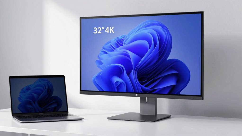 Since spending long hours in front of a monitor can cause discomfort, ergonomic adjustability features become essential when picking a 32-inch 4K display for your MacBook Pro. Adjustable height, tilt, swivel, and pivot options allow you to customize the monitor’s position for maximum comfort, helping to reduce neck and eye strain. An ergonomic stand ensures proper alignment with your natural viewing angle, promoting healthier posture habits. Flexible options also accommodate different workspace setups and user preferences, making your environment more adaptable. Being able to easily modify monitor positioning not only enhances comfort but also boosts productivity by creating a more ergonomic and pleasant viewing experience. Prioritizing these features helps prevent discomfort during long work sessions and supports overall well-being.