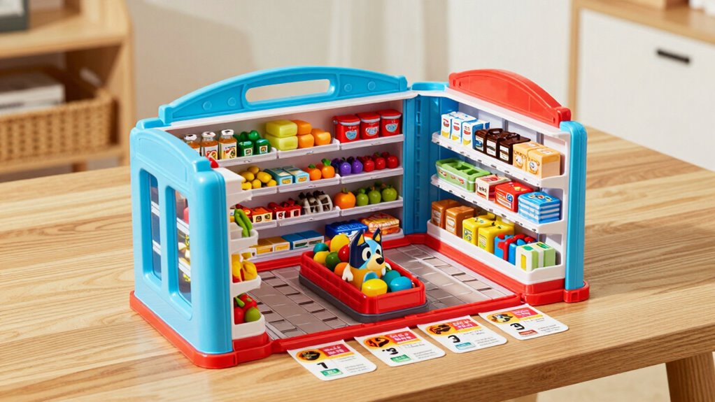 When choosing between online and in-store options for buying a Bluey supermarket playset, it’s important to contemplate price differences and available deals. Online stores often offer more competitive prices thanks to frequent sales, discounts, and price-matching policies that can lower costs. In contrast, in-store prices vary by retailer, region, and current promotions, sometimes making them more expensive. Online shopping also provides access to exclusive deals and limited-time discounts that aren’t available in stores. Additionally, consumers can use comparison tools and feedback forms to report lower prices found elsewhere, helping guarantee they get the best deal. Brick-and-mortar stores may charge more due to overhead costs, whereas online retailers can pass savings directly to shoppers, making online options generally more budget-friendly.