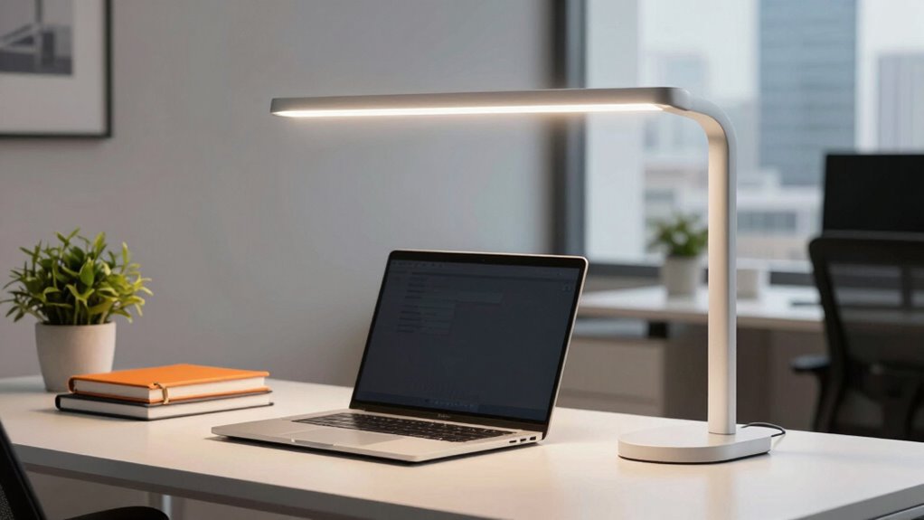 Ever wondered how to guarantee your office desk lamp provides enough light without causing eye strain? Brightness is measured in lumens, with higher values offering a more intense light suitable for detailed tasks. For office work, I recommend a lamp with at least 800 to 1600 lumens to ensure ample illumination. Adjustable brightness levels are essential, letting you customize the light depending on your activity and ambient conditions. Uniformly distributed lumens help create even coverage across your workspace, reducing shadows and glare that can strain your eyes. Stepless dimming capabilities are a bonus, giving you precise control over brightness for maximum visual comfort. Choosing a lamp with the right lumen output and adjustable features guarantees a well-lit, comfortable workspace that minimizes eye fatigue.