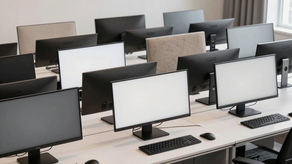 Acoustic screens considerably improve overall office sound quality by absorbing and blocking noise, making conversations clearer. I’ve noticed that they reduce echoes and minimize distractions, creating a more focused environment. By adding these screens, I can concentrate better during meetings and calls, as background chatter and reverberations are muffled. They’re a simple yet effective way to enhance acoustic comfort and guarantee that communication stays crisp and professional.