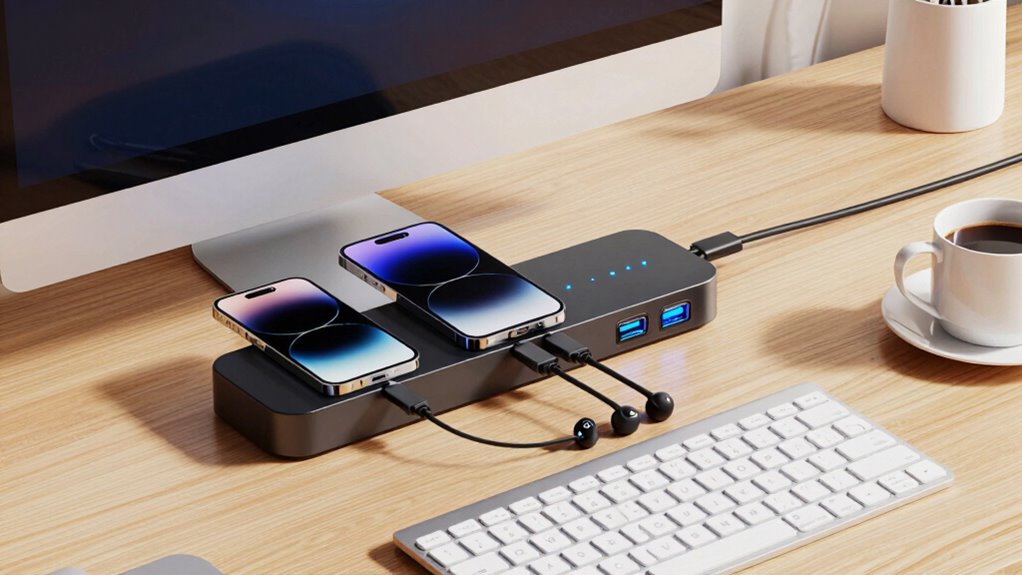 Having enough charging ports is essential to keep all your devices powered simultaneously without juggling multiple chargers. I look for stations with a mix of USB-C and USB-A ports, ensuring compatibility with my smartphone, tablet, and laptop. A station with at least six ports works well, letting me charge multiple devices at once without prioritizing some over others. I also check if the ports support fast charging standards like Power Delivery (PD), so my devices get quick power boosts. For high-power devices like laptops, dedicated ports are a plus, preventing power sharing issues that can slow down charging. By choosing a station with ample, versatile ports, I avoid the hassle of unplugging and re-plugging, keeping my workspace organized and my devices ready to go.