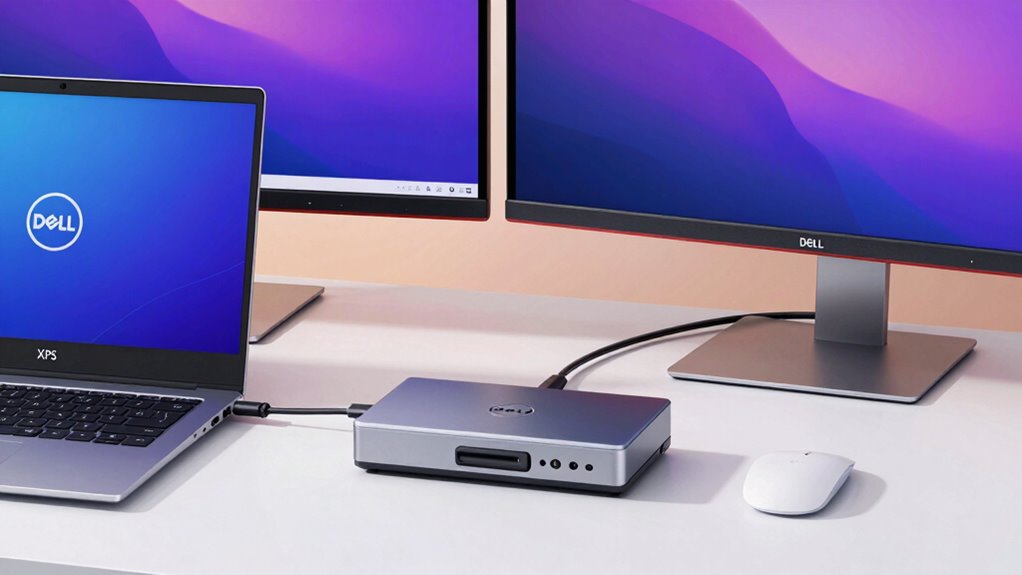 Ensuring your docking station supports the right monitor resolutions is crucial for a seamless dual-monitor setup with your Dell XPS. I recommend checking if the dock can handle 4K at 60Hz for crisp, high-definition visuals. It’s necessary to verify if the dock can extend or mirror multiple monitors simultaneously at your preferred resolutions. Compatibility with your specific Dell XPS model via HDMI, DisplayPort, or VGA also matters to guarantee maximum resolution support. For those needing ultra-high-definition displays, look for docks supporting 5K or even 8K resolutions. Keep in mind that macOS may only mirror at high resolutions, while Windows often supports extended dual monitor outputs at 4K or higher. Matching your monitor resolution needs with the dock’s capabilities guarantees a smooth, high-quality experience.