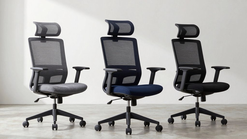 Choosing an ergonomic office chair without a headrest hinges on key posture support features that keep you comfortable and healthy throughout the workday. I look for adjustable lumbar support to ensure proper spine alignment and reduce lower back strain. A breathable mesh backrest with ergonomic curves that conform to natural spinal contours is essential for comfort and airflow. Multi-position recline lock and tension adjustment allow me to customize the backrest’s position, promoting proper posture during different tasks. I also prioritize chairs with supportive, curved backrests that encourage upright sitting and prevent slouching, especially during long hours. Overall, ergonomic support that promotes good posture, with adequate back and shoulder support, helps me stay focused and reduces discomfort without relying on a headrest.