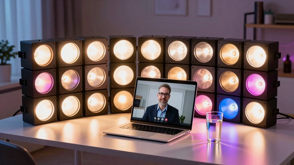 If you’re looking for the best key lights for 2026 video conferencing, I’ve got you covered. The top options include compact ring lights, adjustable LED panels, portable clip-ons, and professional studio lights, all offering high CRI, brightness, and customizable settings. These lights improve your on-camera appearance by providing natural, shadow-free illumination. If you want to discover even more options and features that suit your setup, just keep going—there’s plenty more to explore.