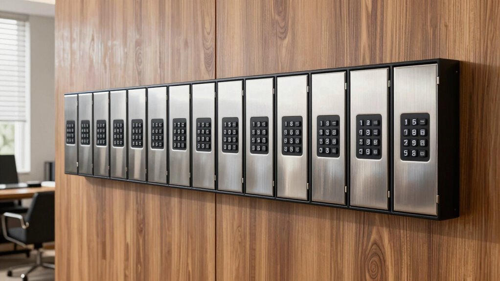 Choosing the right access control options for my home office key lock box can considerably impact security and convenience. I consider whether I want a simple combination lock with customizable codes or a digital keypad that allows multiple user codes and time-based access. Bluetooth and Wi-Fi-enabled lock boxes offer remote control and monitoring via smartphone apps, making it easy to grant or revoke access instantly. App-based controls provide real-time updates and audit logs, ideal for managing multiple users. The decision depends on my security needs and whether I prefer local or remote access. If I want maximum flexibility, digital or smart lock boxes with app controls are the best choice. For straightforward security, combination locks with secure codes work well.