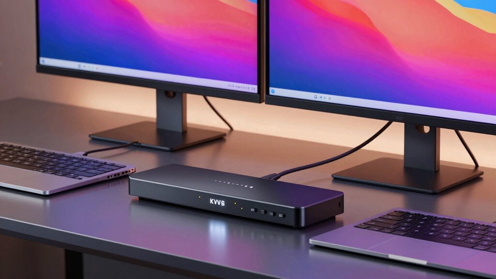 Ensuring compatibility between your devices and a KVM switch is essential for a seamless dual-monitor setup. First, check that the switch supports your operating systems, whether Windows, Mac, Linux, or Unix. Next, verify that your computers and monitors have compatible video output ports like HDMI, DisplayPort, or VGA, and that the switch can handle your monitor’s maximum resolution, such as 4K@60Hz or 8K@60Hz, for the best display quality. Additionally, confirm that the switch offers USB ports (USB 3.0 or USB-A) compatible with your peripherals like keyboards, mice, and external drives. Finally, confirm the switch’s power requirements and connection types match your devices’ specifications to guarantee stable, reliable operation. Compatibility is key to a smooth, efficient setup.
