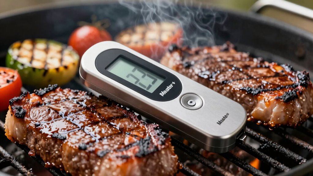 Choosing a meat thermometer with an appropriate temperature range is essential for accurate readings during grilling. You want a thermometer that covers the full spectrum needed for your meats, typically from 14°F to 572°F. A wider range offers versatility, letting you cook everything from delicate fish to high-heat steaks. It’s also imperative that the sensors are properly calibrated within this range to guarantee precision. Accurate temperature measurement is critical for achieving perfect doneness and food safety. Look for a thermometer that maintains high accuracy, ideally ±1.8°F or better, across its entire spectrum. This ensures you’re getting reliable readings no matter what you’re cooking, making your grilling both precise and safe.