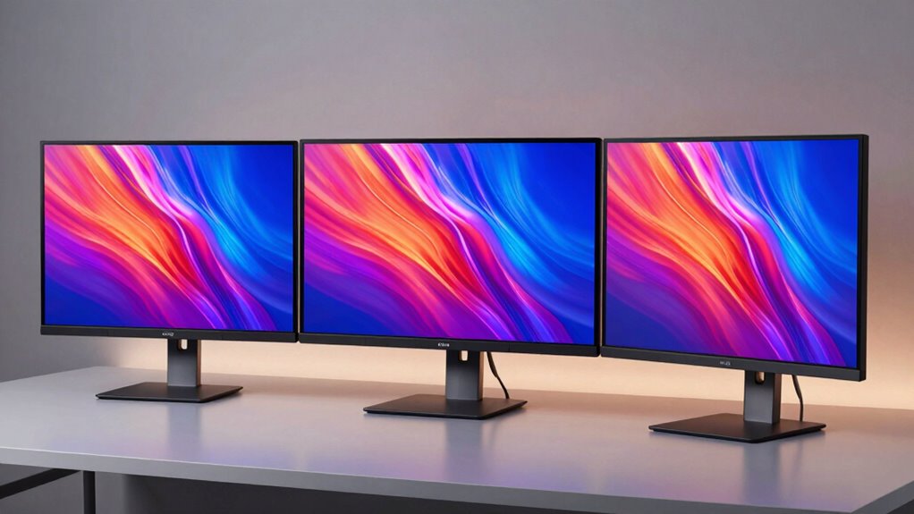 When choosing a mini LED monitor for the office, I focus on display resolution clarity, color accuracy, and brightness levels to guarantee a comfortable work experience. Connectivity options and ergonomic adjustments also play an essential role in making my setup flexible and user-friendly. Understanding these factors helps me select a monitor that enhances productivity and reduces eye strain.