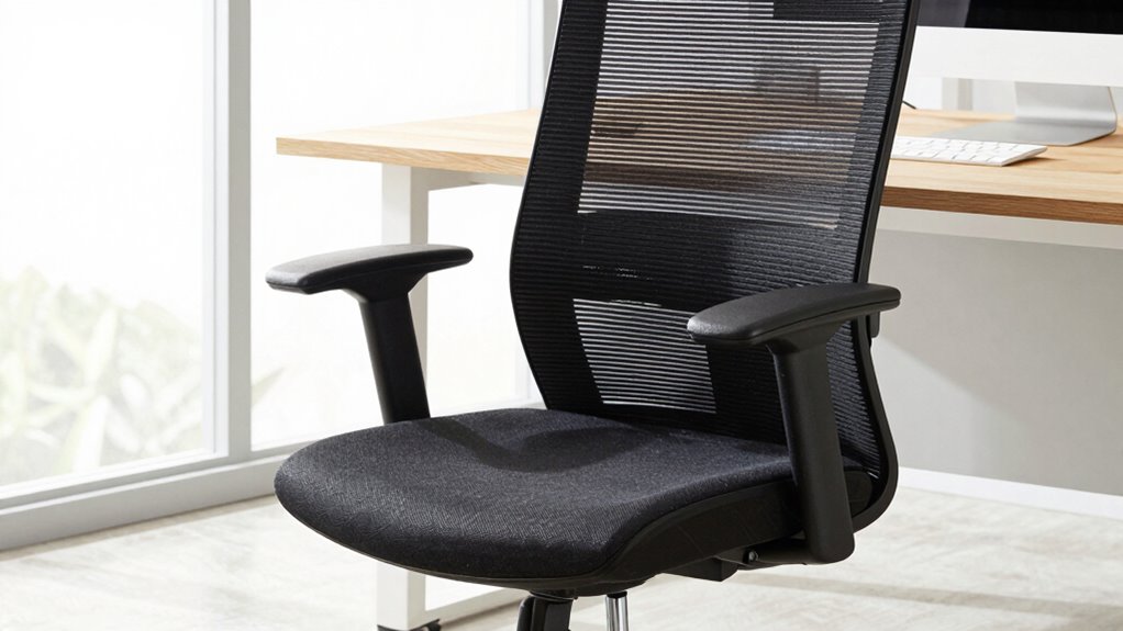 Breathable materials play an essential role in ensuring comfort during long hours at your desk, especially if you suffer from sciatica. Materials like mesh promote better airflow, which helps reduce heat buildup and discomfort. A high-density mesh backrest supports proper ventilation, keeping your lower back cool and dry throughout the day. Breathable fabrics also prevent excessive sweating, alleviating additional discomfort for those with sciatica. Plus, ventilated materials such as mesh are lightweight, making the chair easier to move and more comfortable over extended periods. Choosing an office chair with breathable upholstery can help reduce pressure points and improve circulation, which may ease sciatica pain. Overall, these options are crucial for maintaining comfort and promoting better spinal health during long work sessions.