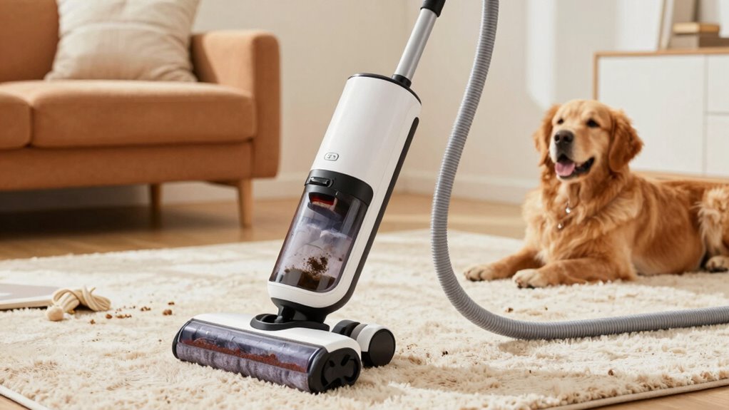 When it comes to cleaning up after pets, ease of use can make all the difference in how often and effectively you tackle messes. A lightweight, ergonomic design (under 10 pounds) helps me maneuver the cleaner easily, even in tight spaces. Devices with intuitive controls and simple setup mean I spend less time figuring out how to operate them and more time cleaning. Clear instructions and visual indicators make quick cleanups straightforward, especially when surprises happen. Features like self-cleaning hoses and tools save effort on maintenance, encouraging regular use. Compact storage and accessories that attach and detach effortlessly help me clean carpets, upholstery, and hard-to-reach spots without hassle. Overall, user-friendly features make sure I stay motivated to keep my home pet mess-free.