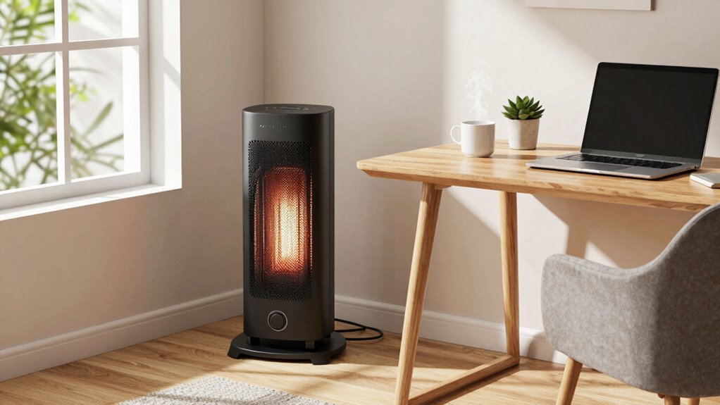 When selecting a space heater for your workspace, considering its size and portability guarantees it fits seamlessly into your environment. Compact, lightweight models are easier to move and position without blocking your workspace or video call view. If the heater has built-in handles or wheels, it becomes simple to relocate, helping you optimize noise levels and airflow during calls. Choosing a size that comfortably sits on your desk or shelf keeps the heater discreet, preventing it from becoming a visual distraction. Smaller, space-saving heaters tend to produce less noise and vibration, creating a quieter environment for clear communication. Pay attention to the overall dimensions and weight to ensure it’s easy to store when not in use or adjust for different room setups.