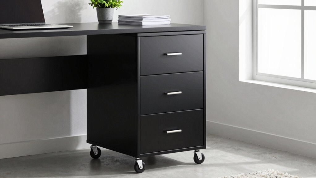 Ensuring smooth mobility is essential when selecting a rolling storage cart for your home office. Look for carts with 360-degree swivel wheels, which allow effortless movement across various floor surfaces like hardwood, tile, or carpet. Prioritize models with lockable wheels to keep the cart stable when needed, preventing unwanted shifting during use. Consider the weight and size of the cart—lighter, appropriately sized options are easier to maneuver without causing strain. Ergonomic handles also make steering more comfortable and control more precise. Additionally, check that the wheels are made from durable materials such as high-quality plastic or rubber to withstand frequent movement and protect your floors from damage. Good mobility features ensure your workspace remains flexible and functional.