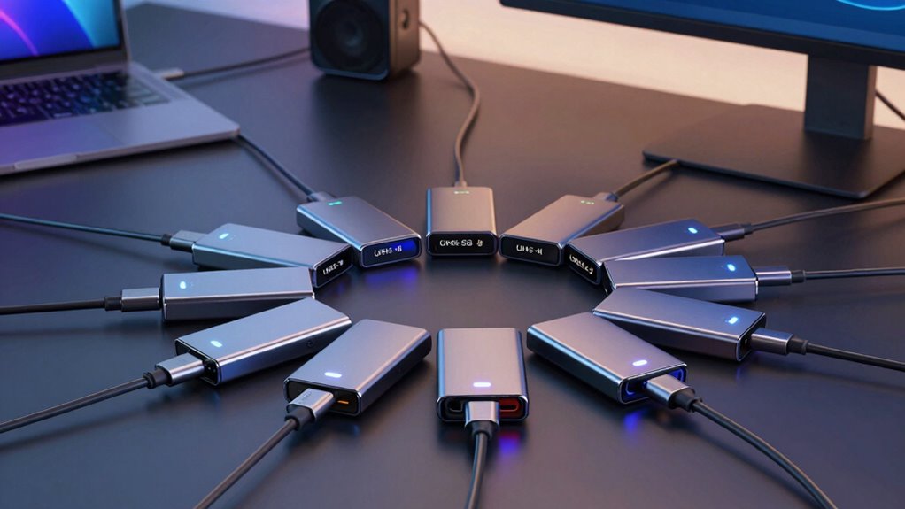 When choosing an SD card reader UHS-II USB-C, I focus on transfer speeds and compatibility to guarantee quick, seamless data transfer. I also consider supported card types, device compatibility, and build quality for durability. Finally, I look for port versatility to match my setup and future needs.