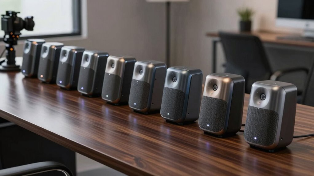 Choosing a speakerphone with excellent microphone quality is essential for clear communication, especially in noisy environments. High-quality microphones with multiple pickup arrays, like omnidirectional or full-duplex mics, capture sound from all directions, ensuring everyone is heard. Microphone sensitivity and sampling rates—32KHz or higher—boost voice clarity and accuracy amid background noise. Features like AI-based noise reduction and echo cancellation further improve sound quality by filtering out unwanted sounds. The microphone’s pickup radius, typically 3 to 6 meters, determines how many participants can be heard clearly without speaking directly into the device. Full-duplex systems enable simultaneous talking and listening, creating a natural, uninterrupted conversation flow. Prioritizing these aspects guarantees your calls are crisp, clear, and free from miscommunication.