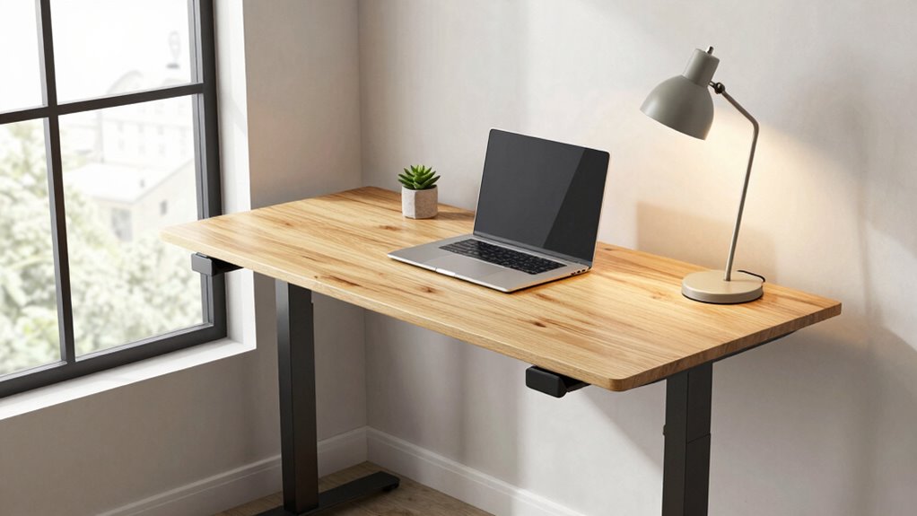 Are you looking for a standing desk that offers easy and precise control in a small space? Many models come with adjustable height settings and preset memory buttons, so you can quickly switch between sitting and standing positions without hassle. Some desks feature LED control panels or touchscreens, giving you real-time height display and fine-tuned adjustments for accuracy. Quiet, multi-motor lifting systems assure smooth transitions with noise levels under 50 dB, keeping your workspace calm. Power options like USB ports and built-in charging stations add convenience, letting you keep devices powered without clutter. Safety features such as anti-collision sensors and safety locks help prevent accidental adjustments and keep operation secure, making your workspace both efficient and safe.