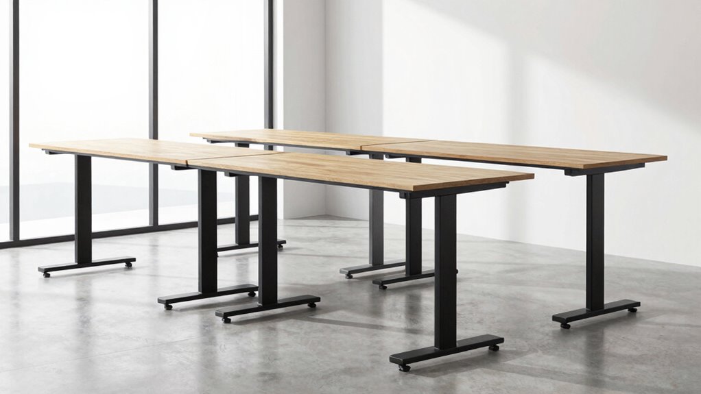 Stability during movement is essential for maintaining a secure workspace, especially with a 4-leg standing desk frame. These frames offer better support because the evenly distributed legs minimize wobbling and tilting. When adjusting height, dual motor systems with synchronized lifting keep the desk balanced, preventing side-to-side sway. A sturdy construction using industrial-grade steel and reinforced joints ensures the frame stays stable throughout transitions between sitting and standing. Anti-collision technology and safety sensors also play a role by reducing sudden shifts that could compromise stability. Additionally, well-calibrated, adjustable crossbars help distribute weight evenly, lowering the risk of tipping. All these features work together to ensure your desk remains steady, even during movement, providing a safer and more reliable workspace.