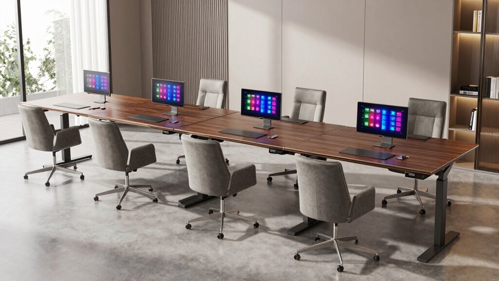 When selecting a standing desk with memory presets, prioritizing stability and build quality is essential for a secure and comfortable workspace. A sturdy desk made from high-quality materials and a robust frame guarantees stability during height adjustments and daily use. Anti-collision technology and reinforced joints help reduce wobbling and maintain balance at every height level. A well-designed build, featuring a low center of gravity and wide, non-slip feet, enhances overall stability—even at maximum height. Industrial-grade steel frames and tested lift mechanisms, like those rated for 50,000 lift cycles, guarantee long-lasting durability and consistent performance. Smooth, controlled motion during height changes minimizes shaking and prevents accidental tipping, providing peace of mind and a safer working environment.