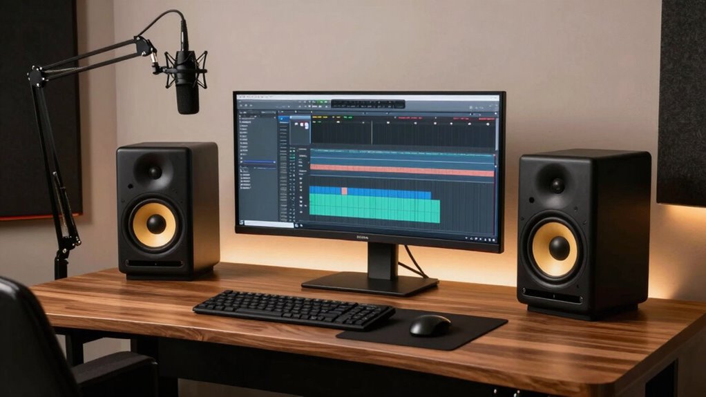 Achieving accurate sound reproduction begins with selecting studio monitors that deliver a flat frequency response, ensuring audio fidelity without coloration. High-quality drivers, like silk dome tweeters and woven composite woofers, are essential for clear, precise sound across all frequencies. These components help distinguish subtle details, making critical listening more effective. Proper room acoustics and placement also play a key role in maintaining accuracy, preventing distortion or resonance that could skew audio. Additionally, adjustable EQ controls allow for fine-tuning to suit your specific environment, enhancing overall precision. Low total harmonic distortion (THD) levels are imperative, as they help keep the sound clean and uncolored. When these factors are combined, your monitors can deliver the true, unaltered sound necessary for professional editing and mixing.