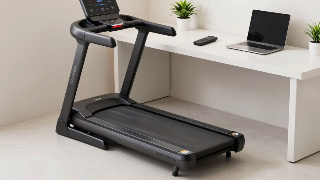 Safety features are essential when selecting an under desk treadmill with remote control because they directly impact your well-being during workouts. Anti-slip belts and shock absorption systems help prevent slips and reduce impact injuries, making each session safer. Emergency stop buttons or quick-stop mechanisms allow me to halt the treadmill immediately if I notice something wrong. Automatic shut-off sensors detect irregular movements or obstructions, ensuring safe operation at all times. Handrails or handle bars provide extra stability, helping to maintain balance and prevent falls. Additionally, low-noise operation below 45 dB minimizes disturbances for me and others nearby. These safety features work together to create a secure environment, giving me confidence to exercise effectively without unnecessary risks.