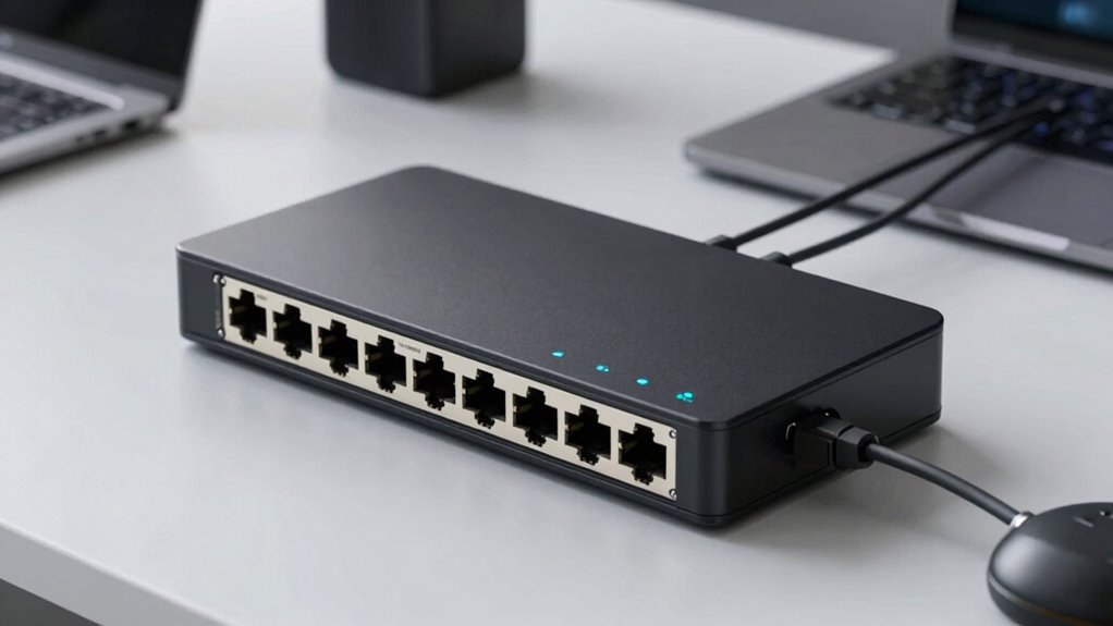 Choosing a switch that’s compatible with your devices is key to unblocking its full potential. First, make sure the switch’s ports support the same Ethernet standards, like IEEE 802.3bz, as your devices for seamless operation. Check if your existing cabling, such as Cat5e or higher, can handle 2.5Gb speeds to avoid bottlenecks. Auto-negotiation support is essential; it allows the switch to automatically adjust to your device’s maximum supported speed, ensuring maximum performance. Also, verify that your connected devices—like NAS units, gaming consoles, or PCs—have compatible 2.5Gb Ethernet ports to fully utilize the switch’s capabilities. Finally, consider if the switch supports backward compatibility with lower speeds, which helps integrate older devices into your network smoothly.