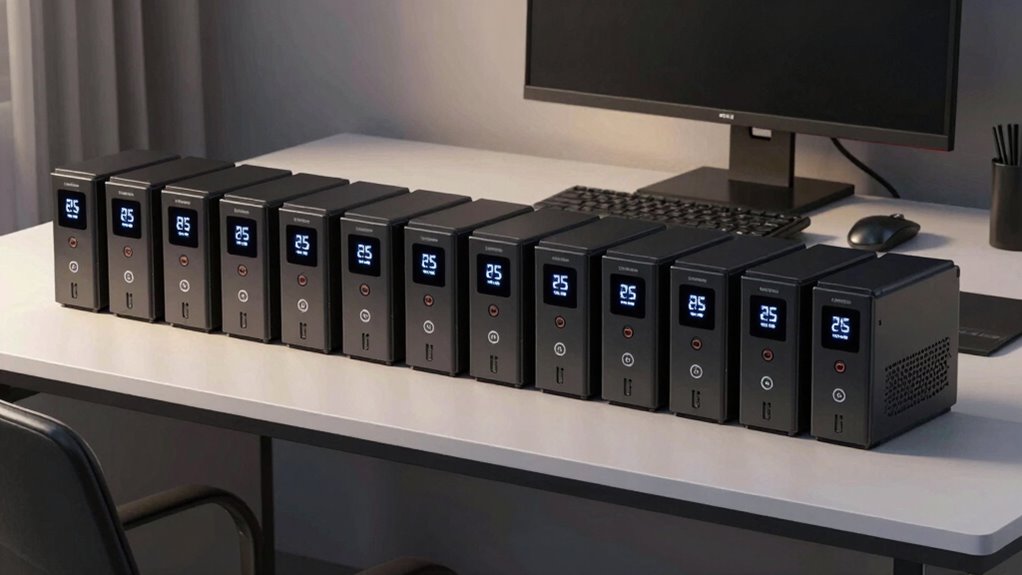 The runtime duration of a UPS battery backup is primarily influenced by the total wattage of your connected devices and the capacity of the UPS’s battery. Higher-capacity units generally provide longer backup times, allowing your desktop and essential peripherals to stay powered during outages. Keep in mind that as you add more devices or if they draw more power, the runtime decreases. Manufacturers often specify approximate runtimes at half load and full load, helping you estimate how long your setup will last. To maximize runtime, choose a UPS with a higher VA or watt rating than your total device consumption. Using energy-efficient devices can also help extend backup time, ensuring you have enough power to save work and shut down safely during an outage.