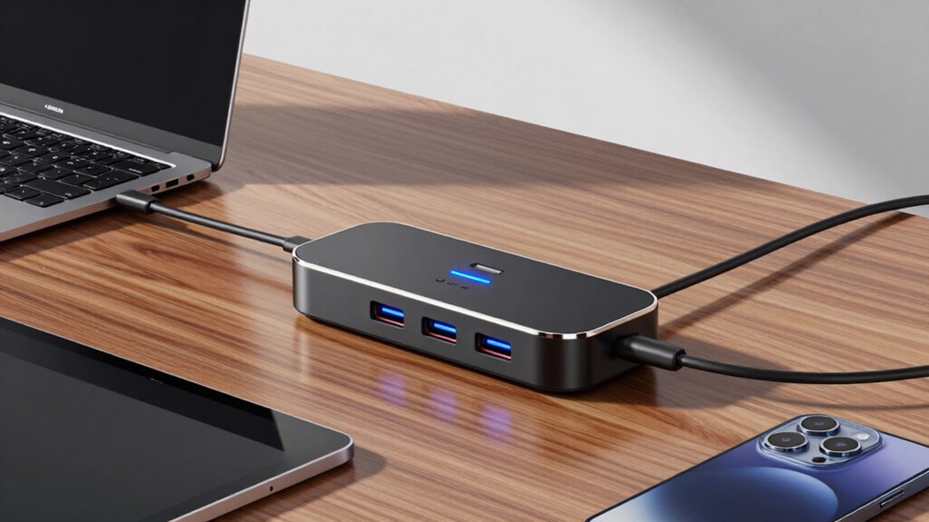 As I looked around my cluttered desk, I realized the right USB-C hub could truly change my experience. It’s like finding that missing puzzle piece—suddenly, everything fits perfectly. With the right charging hub, I can power multiple devices effortlessly, turning chaos into order. If you’re tired of tangled cords and slow charging, one of these hubs might just be the coincidence you need to streamline your tech life.