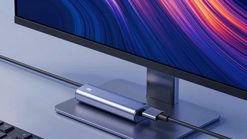 Choosing the right USB-C to HDMI adapter for 4K at 60Hz depends heavily on its support for high resolution and smooth refresh rates. Look for an adapter that can handle a maximum resolution of 3840×2160 pixels at 60Hz to guarantee true 4K display quality. The refresh rate is vital for fluid motion, so confirm it supports 60Hz rather than defaulting to lower rates like 30Hz, which can cause choppy visuals. Compatibility with DisplayPort Alt Mode over USB-C is essential for achieving 4K@60Hz output. Additionally, both your device and display need to support 4K at 60Hz to fully leverage the adapter’s capabilities. Paying attention to these factors guarantees a seamless, high-quality viewing experience without visual lag or degradation.