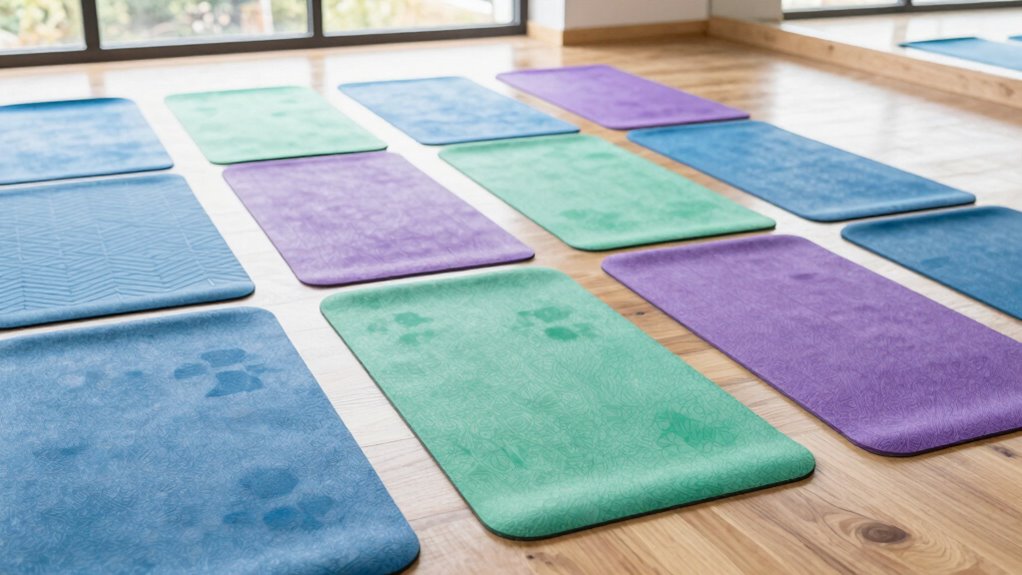 I recommend looking for mats made of natural rubber, as they offer the best grip for beginners. I’ve found that rubber provides excellent traction, even when sweat starts to build up during practice. Plus, it’s durable and eco-friendly. I’d avoid mats with smooth surfaces or cheap synthetics, as they tend to slip more easily. Natural rubber mats give me confidence and stability, making my practice safer and more enjoyable.